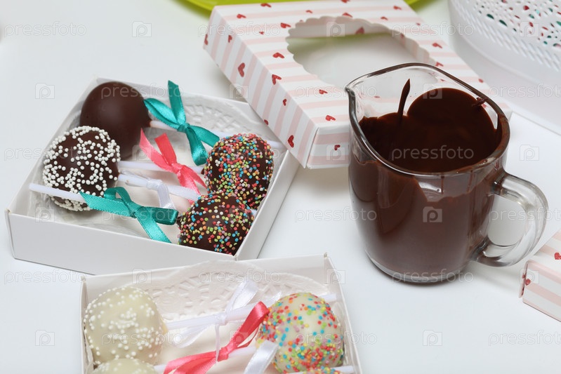 Кейк-попсы, украшенные бантом из тесьмы, упакованы в подарочную коробку. Рядом стоят чашечки с растопленным шоколадом