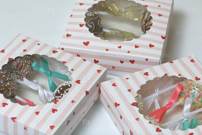 Кейк-попсы, украшенные бантом из тесьмы, упакованы в подарочную коробку. В крышке коробки прозрачное окошко