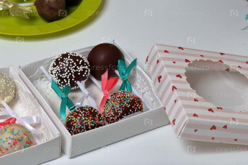 Кейк-попсы, украшенные бантом из тесьмы, упакованы в подарочную коробку
