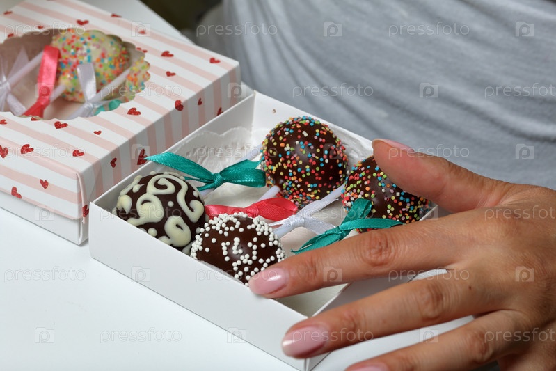 Кейк-попсы, украшенные бантом из тесьмы, упакованы в подарочную коробку. Женщина закрывает коробку