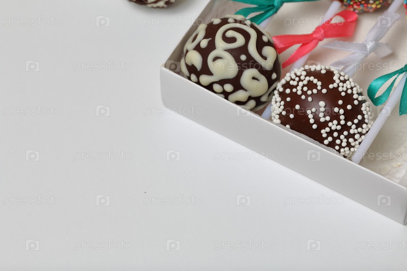 Кейк-попсы, украшенные бантом из тесьмы, упакованы в подарочную коробку