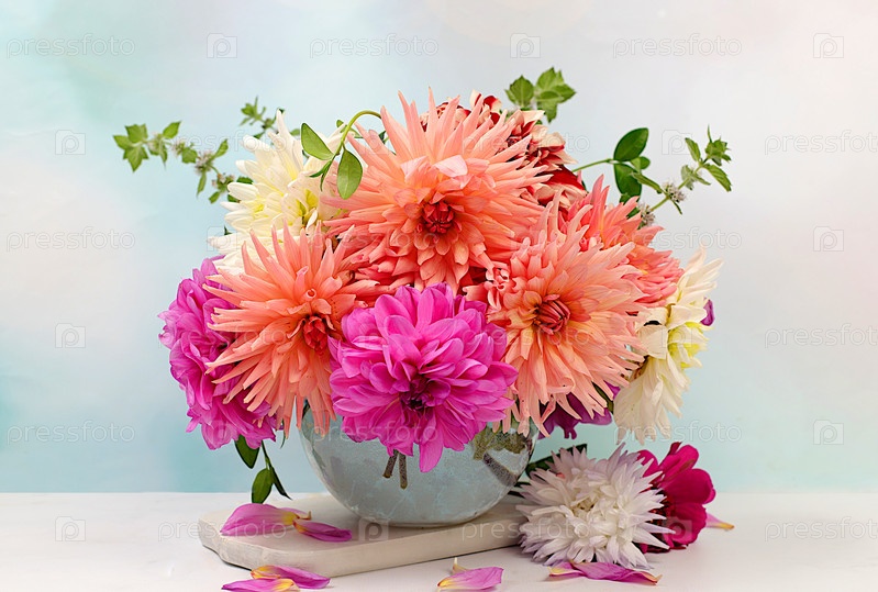 Красивые цветы георгины, астры, лютики в вазе, осенний баннер для рекламы, абстрактная цветочная композиция, праздничная открытка, сезонный натюрморт, выборочный фокус