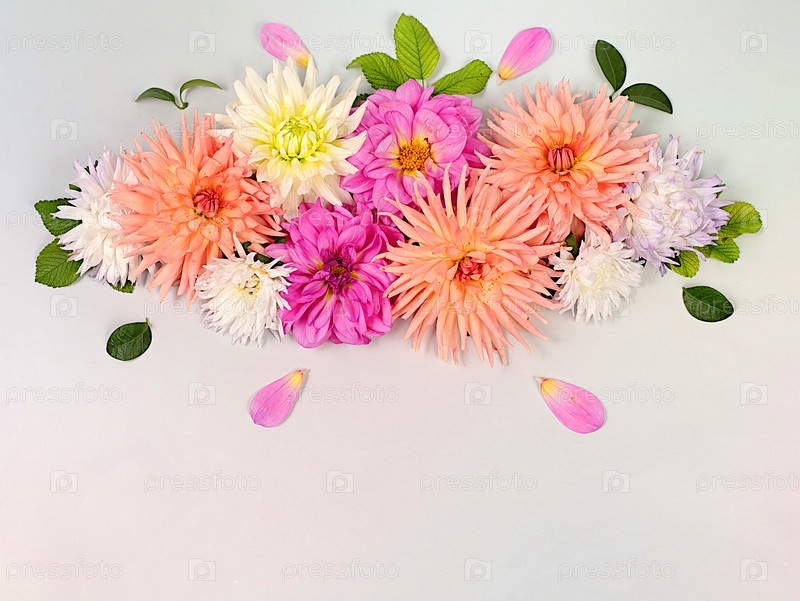Цветы георгины, астры, лютики на светлом фоне, осенний баннер для рекламы, абстрактная цветочная композиция, плоская планировка. Праздничная открытка с местом для текста, селективный фокус