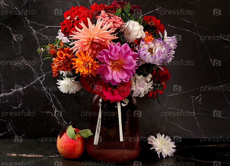 Абстрактная цветочная композиция, Красивый натюрморт с букетом георгинов, астр, бархатцев на старом мраморном столе, осенний баннер, деревенский стиль, праздничная открытка, селективный фокус