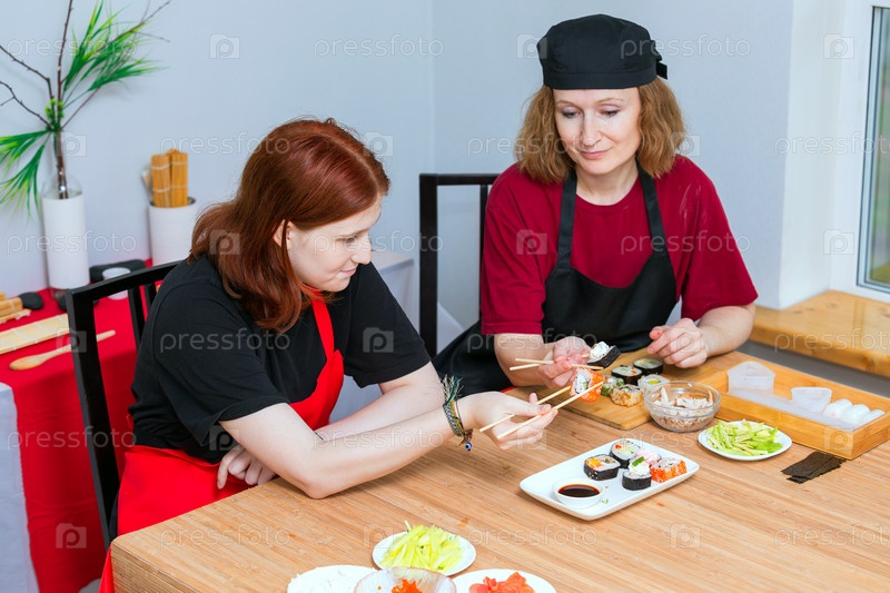 Взрослая женщина и ее дочь-подросток держат палочки для еды и едят суши-роллы