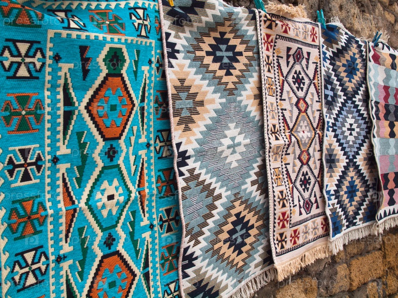 Продаваемые туристам ковры с традиционными дагестанскими узорами висят в ряд на стене дома в Дербенте, Дагестан, Россия