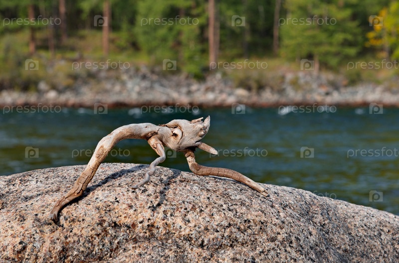 Россия, Западная Бурятия. Причудливая коряга в виде сказочного уродливого чудовища на прибрежном камне реки Тисса