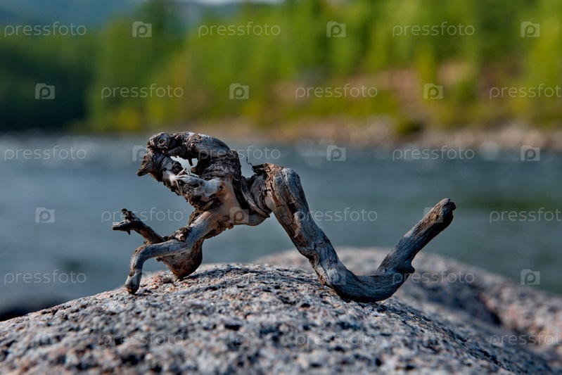 Россия, Западная Бурятия. Причудливая коряга в виде сказочного уродливого чудовища на прибрежном камне реки Тисса