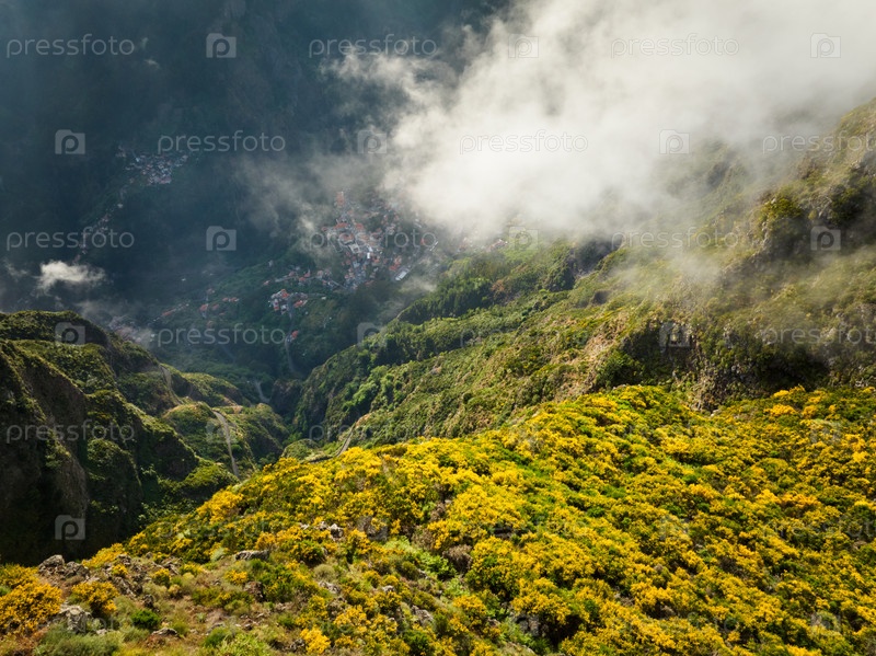 Вид с дрона на деревню Куррал-дас-Фрейрас из Мирадурос-ду-Паредау с цветущими желтыми кустарниками цитиса, остров Мадейра, Португалия