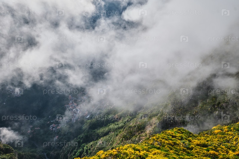 Вид с дрона на деревню Куррал-дас-Фрейрас из Мирадурос-ду-Паредау с цветущими желтыми кустарниками цитиса, остров Мадейра, Португалия
