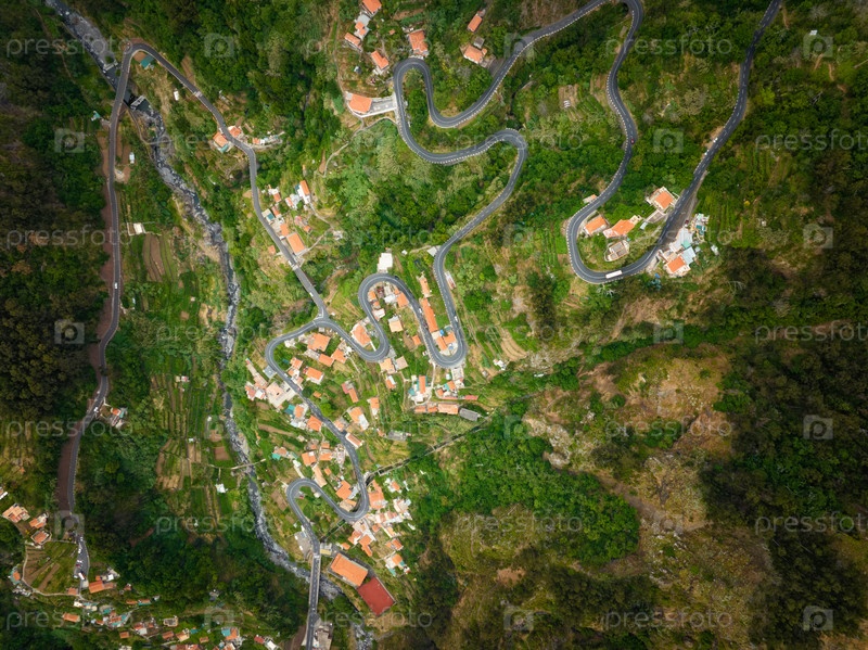 Вид с воздуха на деревню Куррал-дас-Фрейрас. Мирадуру-да-Эйра-ду-Серрадо, Мадейра, Португалия