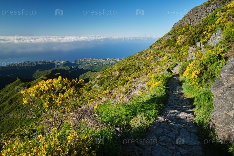 Пешеходный маршрут в горах к Пику-Руйву с цветущими кустарниками Cytisus, остров Мадейра, Португалия
