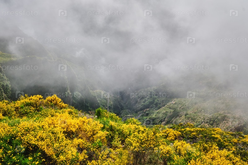 Вид на горы Мадейра в облаках с цветущими кустарниками Cytisus на закате.Остров Мадейра, Португалия