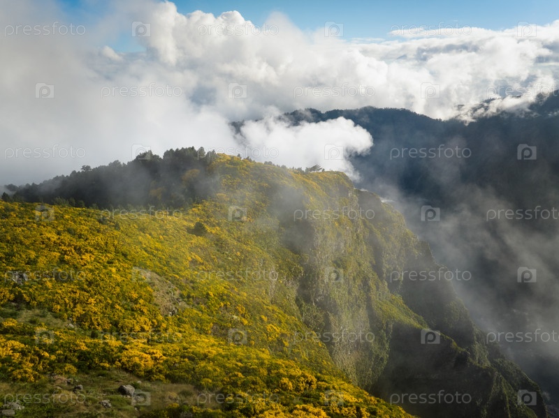 Вид на горы Мадейра в облаках с цветущими кустарниками Cytisus на закате.Остров Мадейра, Португалия