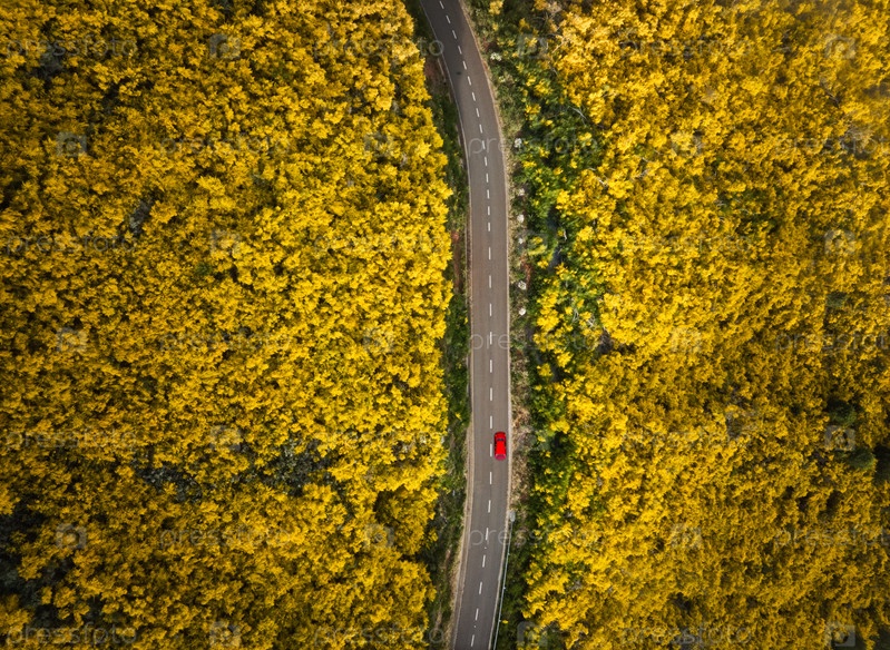 Вид с воздуха на дорогу с красным автомобилем среди желтых цветущих кустарников Cytisus недалеко от Пику-ду-Арейру, Португалия