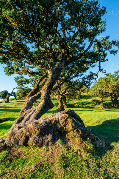 Многовековые деревья тил в фантастическом волшебном идиллическом лесу Фанал-Лаурисильва на закате. Остров Мадейра, Португалия