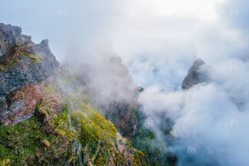 Гора, покрытая туманом и облаками, с цветущими кустами Cytisus. рядом с Пику-де-Арейру, остров Мадейра, Португалия