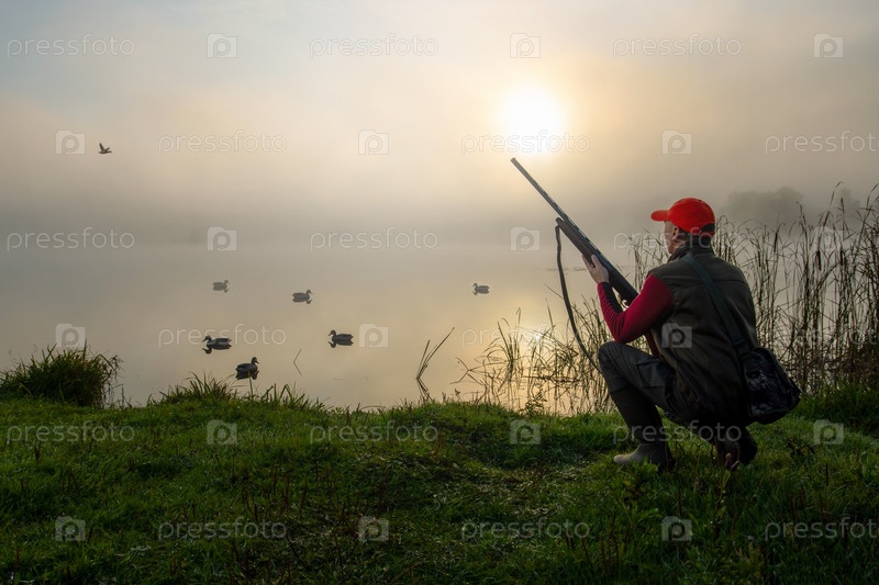 Охота на уток. Охотник на водоплавающую дичь на берегу озера во время охоты на уток на рассвете