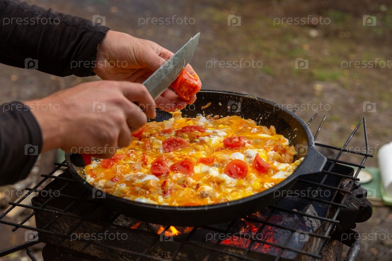 Мужчина режет помидоры, чтобы пожарить их с яйцами