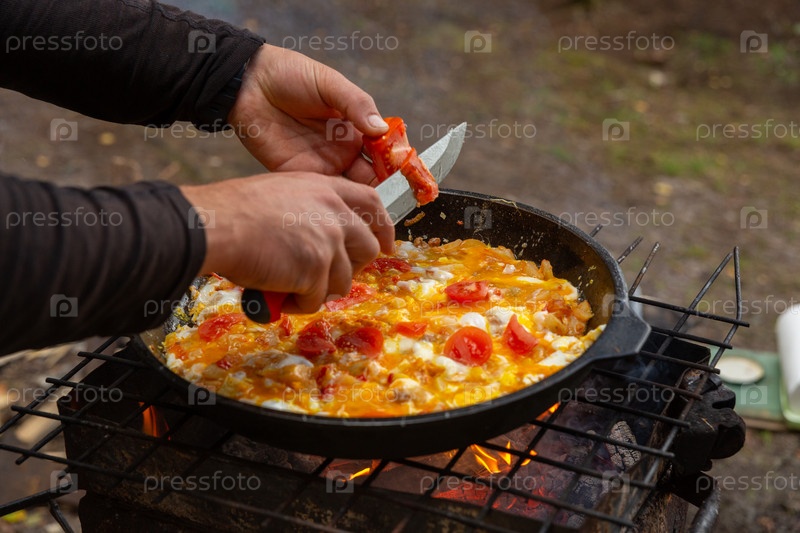 Мужчина режет помидоры, чтобы пожарить их с яйцами