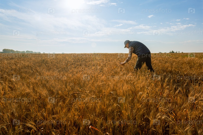 Фермер стоит на пшеничном поле, осматривая посевы пшеницы