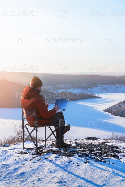 Мужчина использует ноутбук на шезлонге на берегу озера зимой. удаленная работа, свобода, путешествия, ведение блога