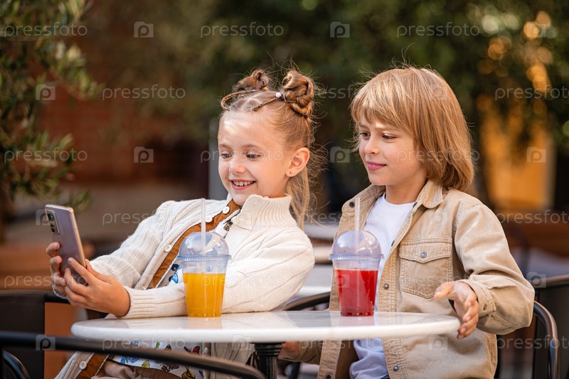 Подростки весело общаются, делают селфи и пьют фруктовый коктейль, сидя за столиком в летнем кафе