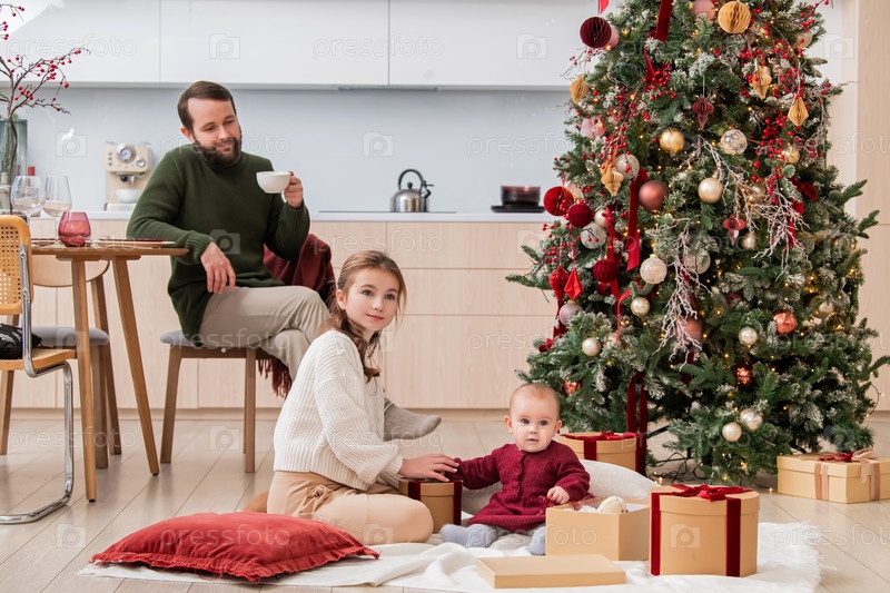 Отец расслабляется и наблюдает за детьми, играющими в домашнем интерьере возле рождественской елки. Зимние праздники и концепция семьи