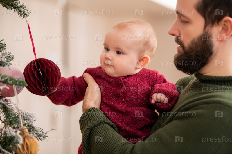 Зимние каникулы и семейная концепция - счастливый отец среднего возраста и маленькая дочь украшают рождественскую елку шаром дома