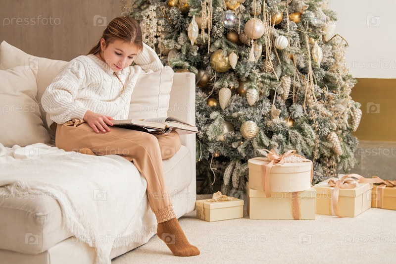 Девочка читает книгу, сидя на диване рядом с рождественской елкой на фоне интерьера гостиной