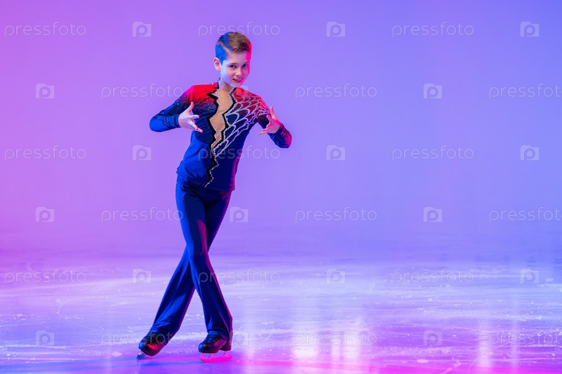 Мальчик-фигурист катается на льду. С праздничной сиреневой подсветкой