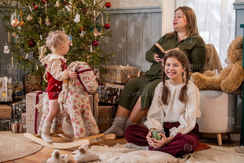 Семья с детьми отдыхает в интерьере загородного дома на фоне новогодней елки