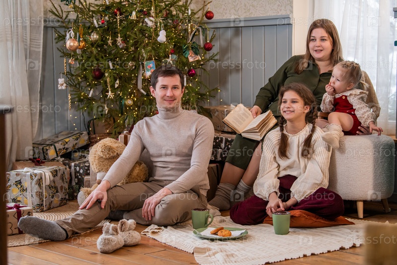 Семья с детьми отдыхает в интерьере загородного дома на фоне новогодней елки
