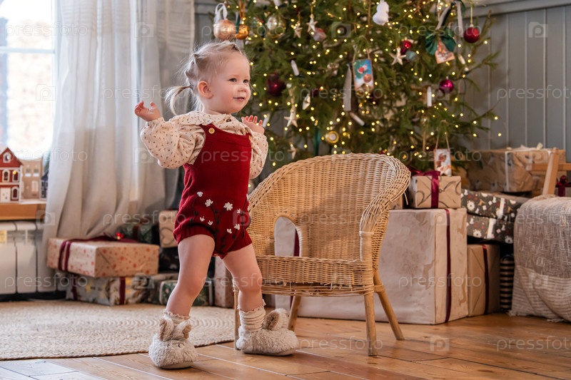 Маленькая девочка радуется в предвкушении подарков на фоне елки в интерьере загородного дома. Теплая уютная атмосфера в винтажном деревенском стиле