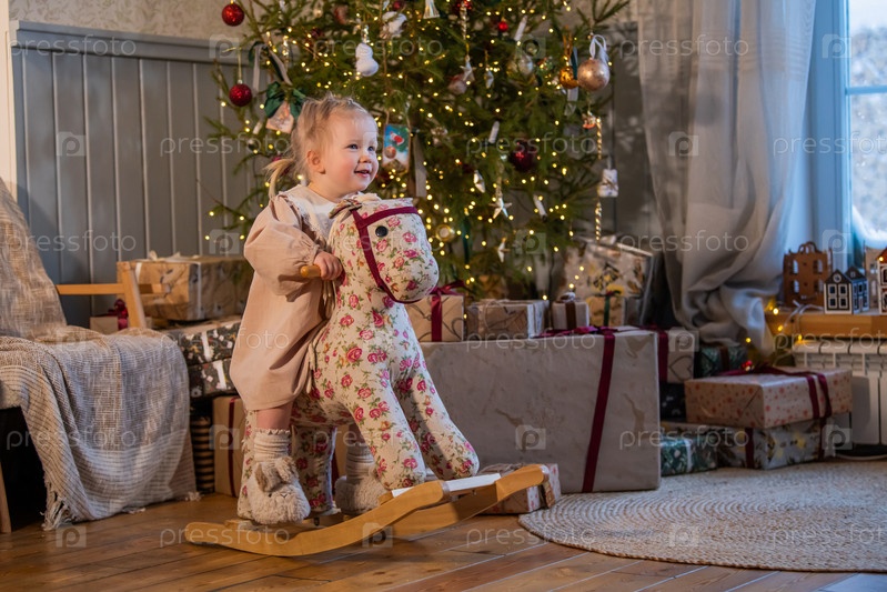 Маленькая девочка сидит на качалке на фоне рождественской елки в интерьере загородного дома. Теплая уютная атмосфера в винтажном деревенском стиле