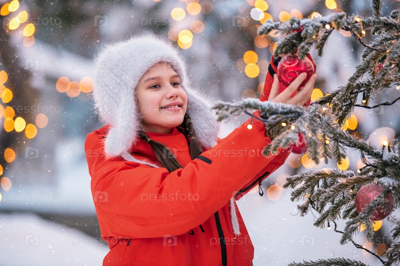 Девочка-подросток украшает рождественскую елку на улице в снежный зимний день