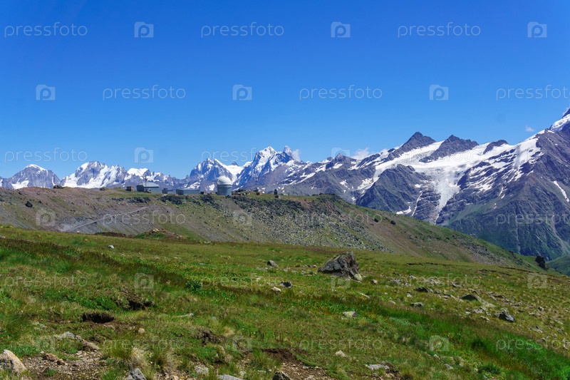 Горный пейзаж с альпийским лугом, обсерваторией вдалеке и горными вершинами на заднем плане