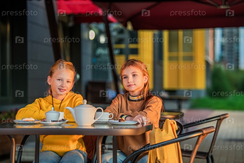 Две школьницы сидят за столиком в городском летнем кафе и пьют кофе и чай со сладостями