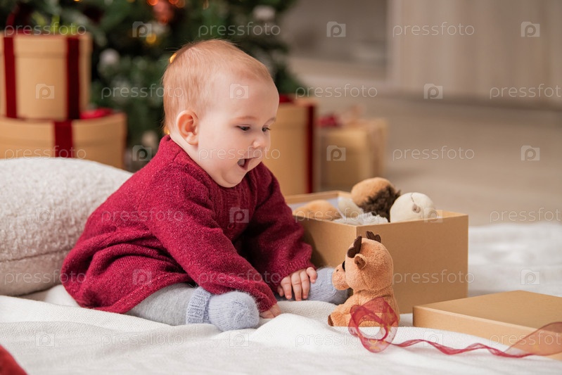 Веселый малыш сидит среди подарочных коробок и игрушек в домашнем интерьере рядом с рождественской елкой