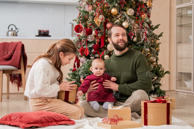Отец с двумя детьми сидит среди подарочных коробок и игрушек в домашнем интерьере рядом с рождественской елкой. Зимние праздники и семейная концепция