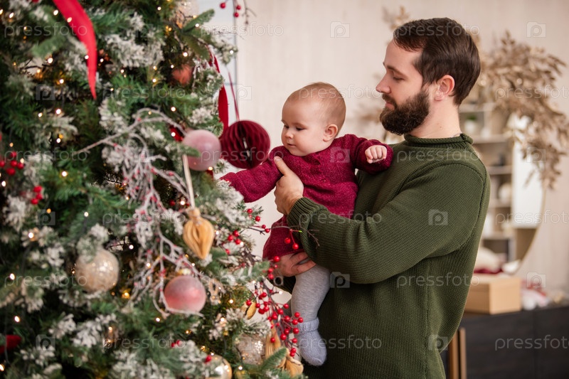 Зимние каникулы и семейная концепция - счастливый отец среднего возраста и маленькая дочь украшают рождественскую елку шаром дома