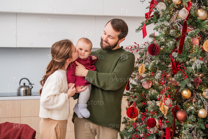 Отец с двумя детьми сидит среди подарочных коробок и игрушек в домашнем интерьере рядом с рождественской елкой. Зимние праздники и семейная концепция