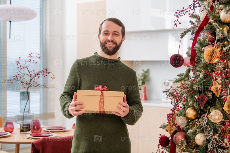 Концепция Рождества и Нового года - портрет красивого мужчины, держащего подарочную коробку в украшенной гостиной с рождественской елкой и огнями