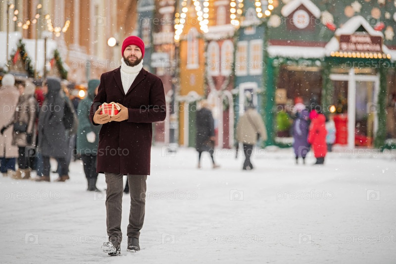 Счастливый улыбающийся мужчина в зимней одежде на уличном рождественском рынке идет с подарками в руках