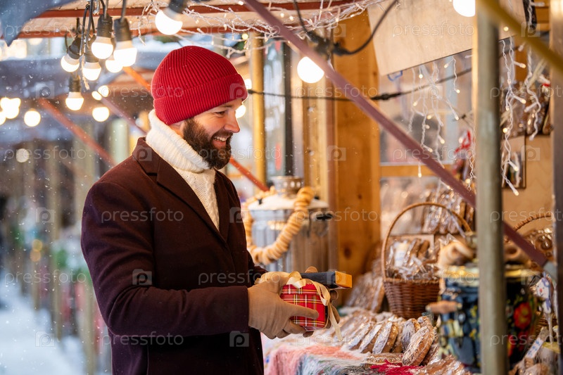 Счастливый улыбающийся мужчина в зимней одежде выбирает и покупает подарки на рождественской ярмарке на центральной городской площади в снежный день. Рождественские покупки