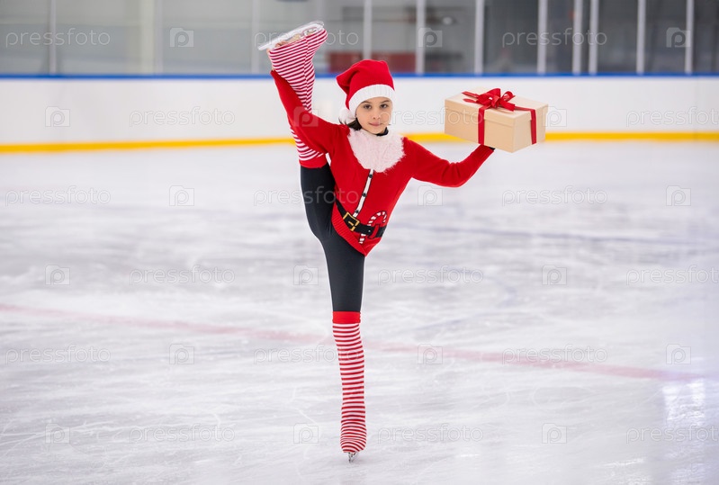 Маленькая девочка-фигуристка в костюме Санта-Клауса с подарком в руках катается на коньках по льду крытой арены