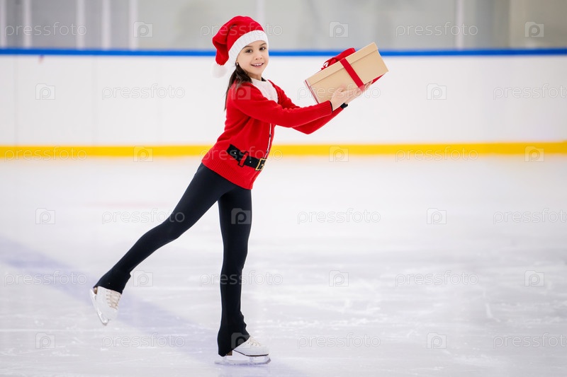 Маленькая девочка-фигуристка в костюме Санта-Клауса с подарком в руках катается на коньках по льду крытой арены