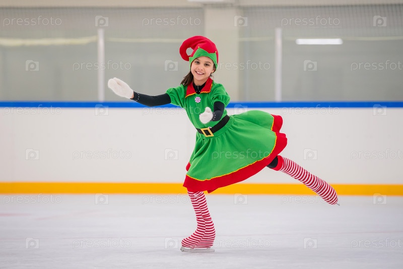 Маленькая девочка-фигуристка, одетая как рождественский эльф, катается на льду крытой арены
