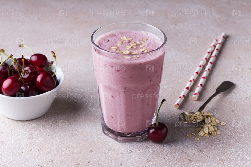Молочный коктейль с вишней, йогуртом и овсянкой, соломинки для питья, миска со свежей вишней на бежевом фактурном фоне