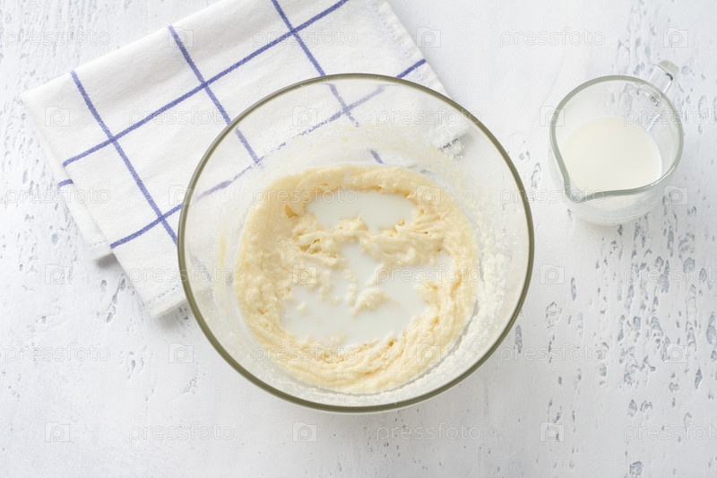 Стеклянная миска со взбитой яично-сливочно-сахарной массой, добавляем молоко на светло-голубом фоне, вид сверху. Готовим домашние молочные кексы, своими руками, шаг за шагом, шаг 4